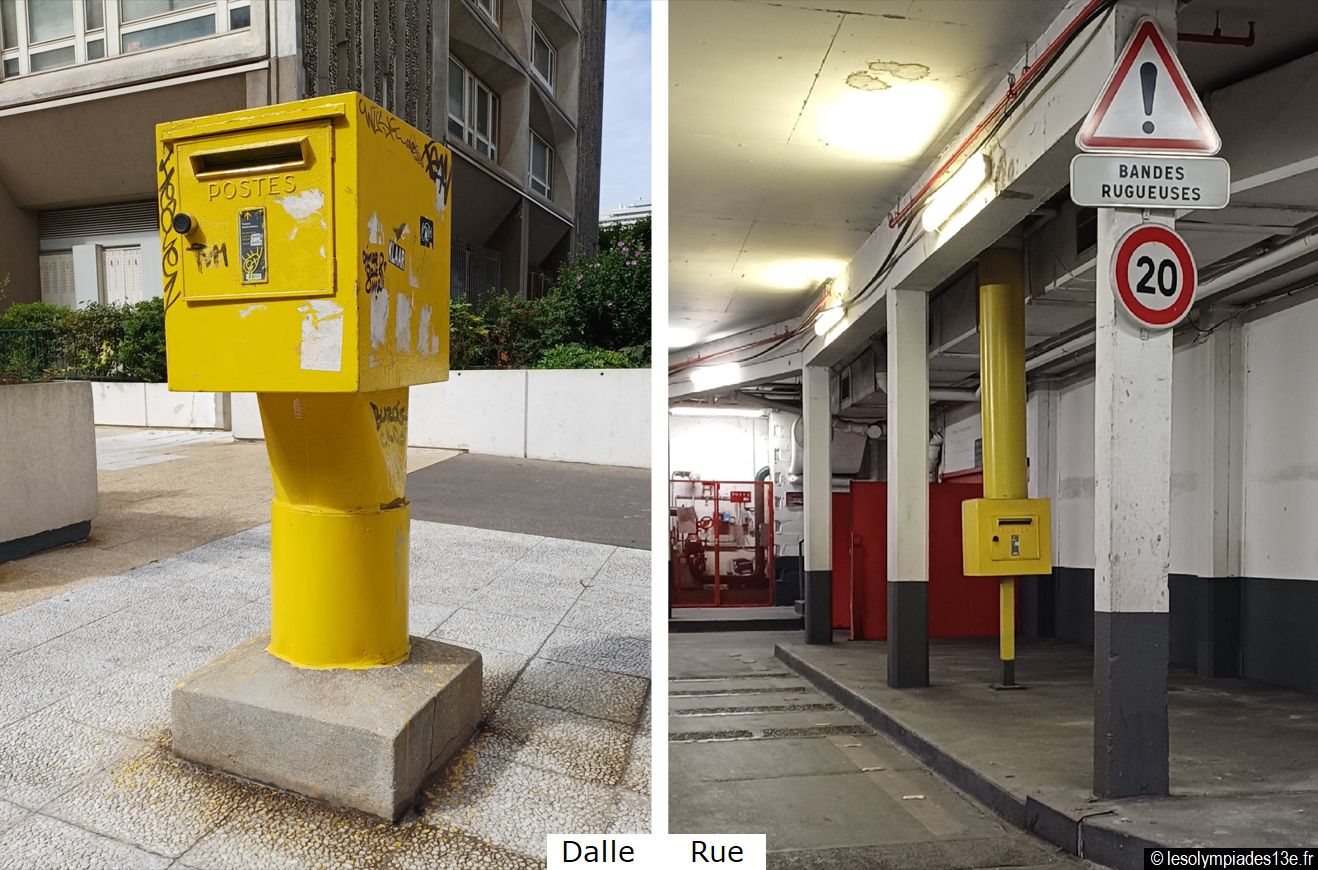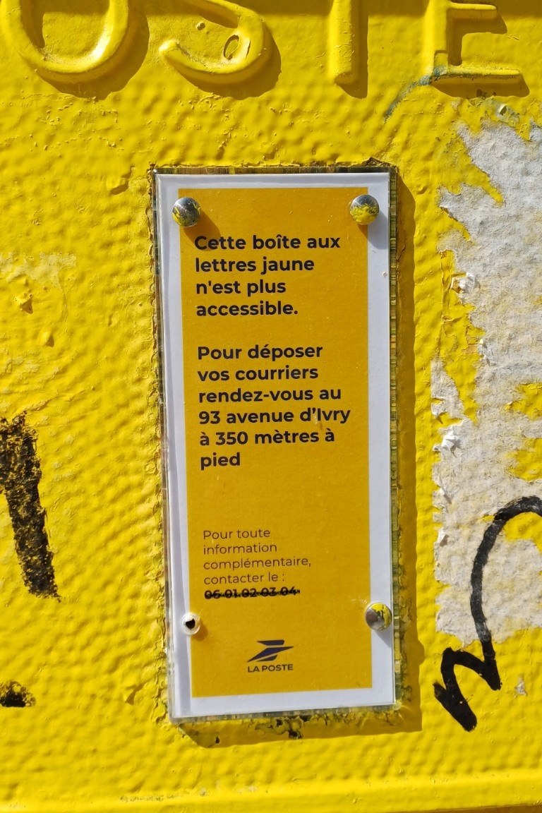 La boîte-aux-lettres jaune est de nouveau indisponible et cette fois-ci sans grand espoir de remise en service. La Poste invite les habitants de la dalle (dont les personnes à mobilité réduite) à déposer leur courrier dans celle géographiquement la plus proche, située à l'angle de la rue Baudricourt et de l'avenue d'Ivry, soit pour les personnes à mobilité réduite: 700 mètres aller-retour, un escalier à emprunter et deux rues à traverser dans chaque sens.