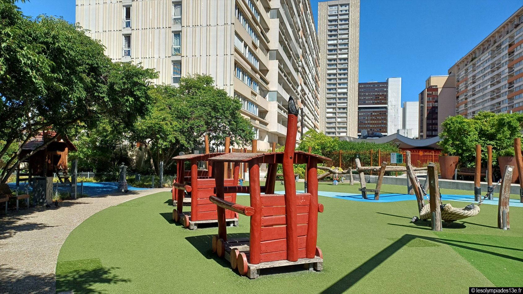 Un jardin public de 950 m², avec une aire de jeux pour enfants, est situé face à la tour Anvers. Les concepteurs de cet espace à la fois verdoyant et ludique ont souhaité récréer les paysages de l'Asie, sans pour autant oublier d'y installer un petit train en souvenir du passé ferroviaire de la dalle. Ouvert en 2014, les jeux ont vieilli et mériteraient d'être restaurés, à l'instar du pont suspendu dont seuls les poteaux subsistent !