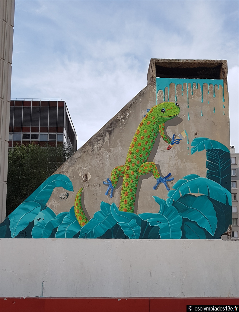Dans le cadre du Festival Arts Olympiades (Septembre 2019) l'artiste Louyz a peint un imposant lézard, son animal fétiche, sur la dalle haute. Trois ans plus tard, l'artiste a réalisé deux fresques, l'une sur le mur du jardin partagé et l'autre sur le grand pan de mur séparant le jardin de la crèche.