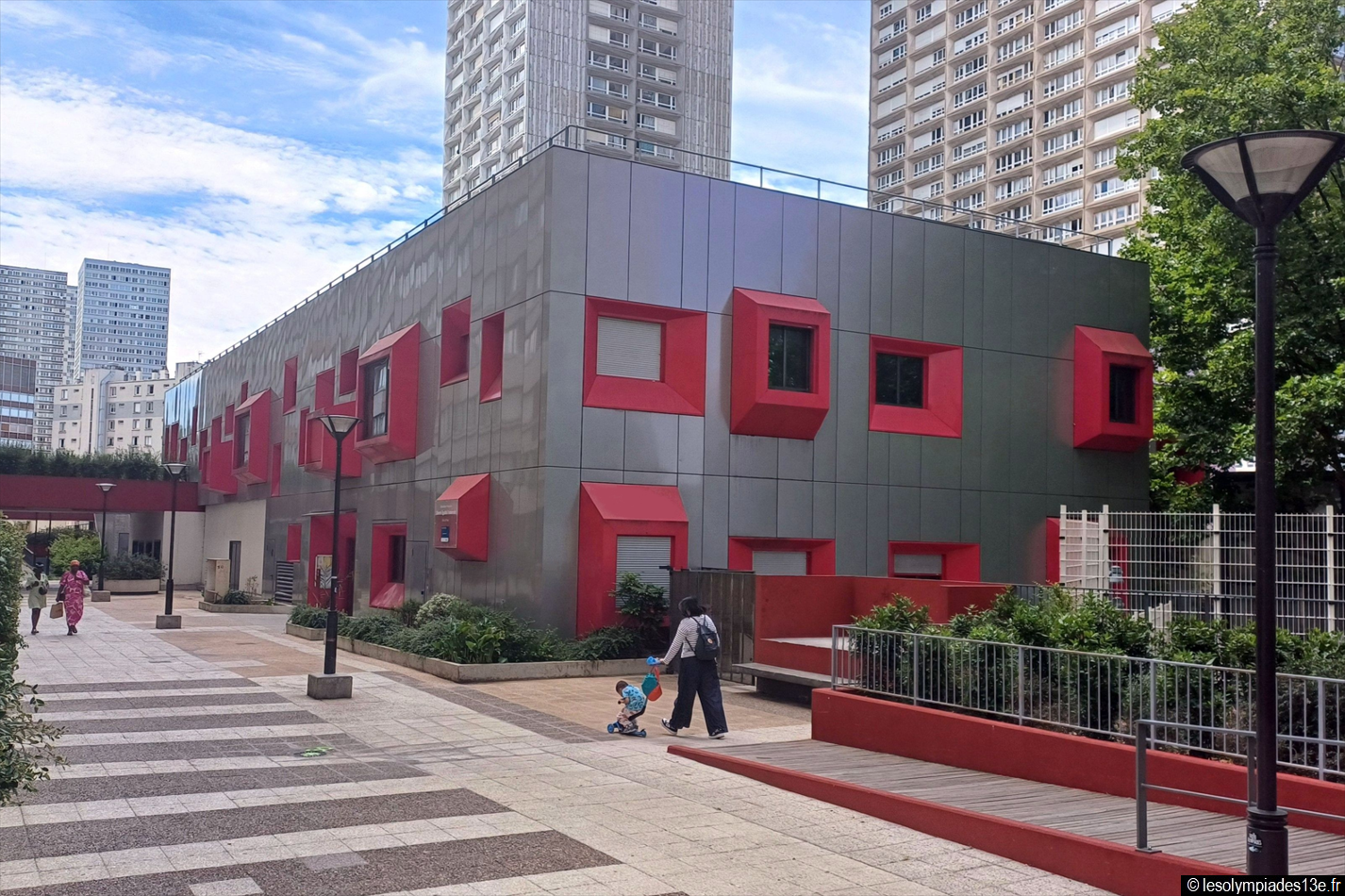Une école maternelle publique | École maternelle Les Olympiades | est située à proximité des tours Rome (sur le côté opposé aux halls d'entrée) et Mexico. Rénovée profondément et agrandie, on doit les belles façades irisées du bâtiment et percées de baies de couleur framboise au cabinet "Eva Samuel architecte urbaniste et associés". Bien qu'éloignée de la rue du Disque son adresse est au numéro 30 de cette rue.