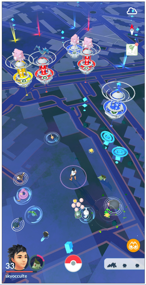La dalle des Olympiades est également un espace de jeu en réalité augmentée (1), bien connu de joueurs en quête de Pokémon. Et pour cause, elle est truffée de PokéStops (sorte de totems permettant d'obtenir des objets virtuels qui aident les joueurs dans leur aventure), d'arènes de combats, et bien sûr, de Pokémon à foison.