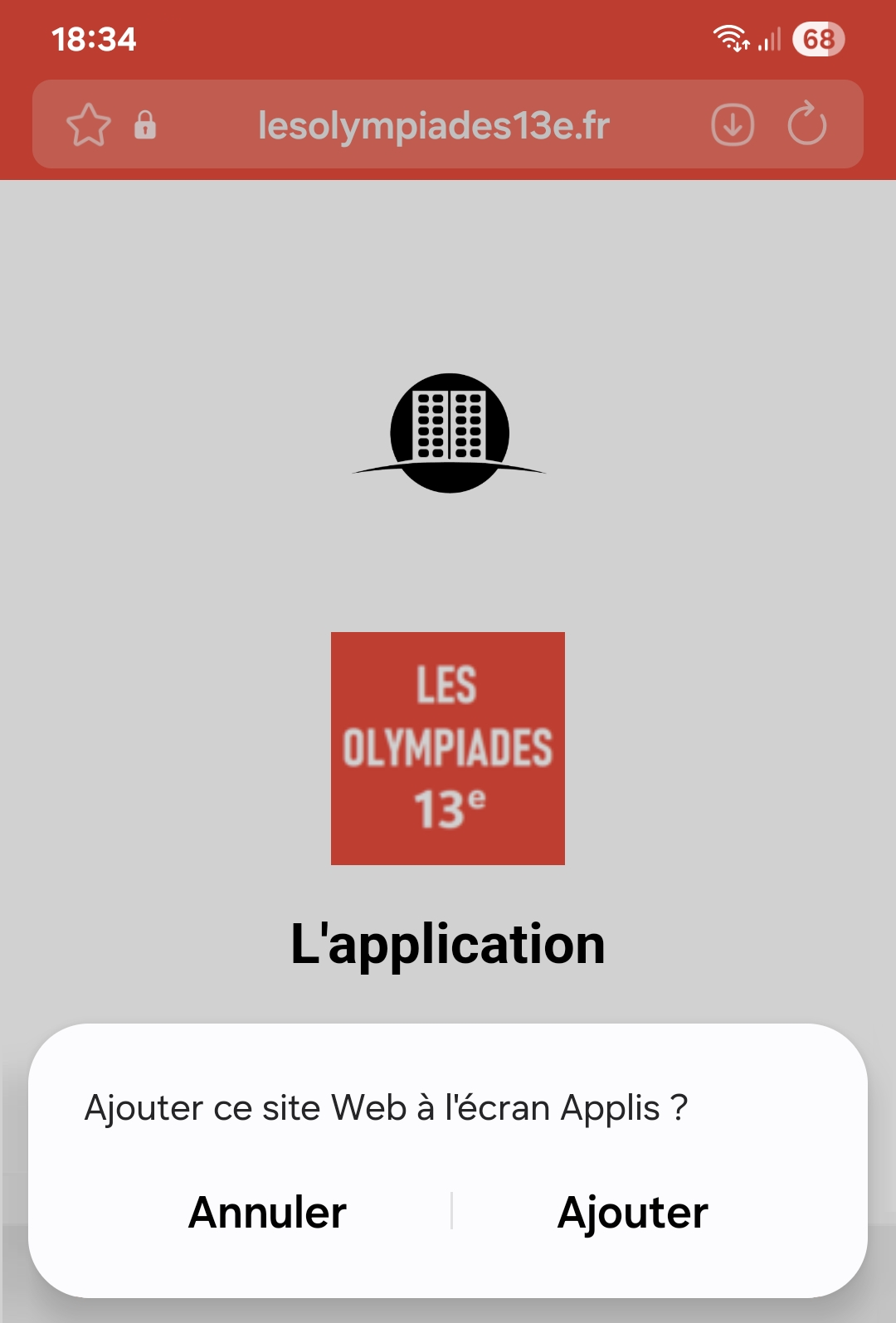 Installez l'application Les Olympiades 13e sur votre mobile. Elle vous permettra d'accéder directement au site tout en bénéficiant d'un affichage optimisé. Aucune autorisation n'est requise de votre part pour son fonctionnement ! La fenêtre d'installation illustrée ci-dessous s'ouvre automatiquement au chargement de cette page sur votre Smartphone... Cette fonction, intégrée au site, ne fonctionne pas avec certains navigateurs (Firefox, Safari...)